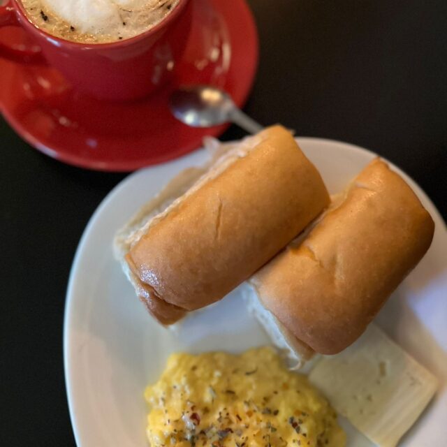 2 pãezinhos de leite, 01 ovo, 01 fatia de queijo coalho e, 01 cappuccino italiano